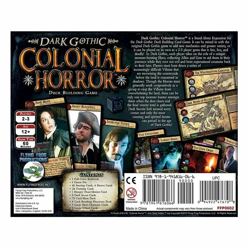 The Colonial Horror Expansion for the Dark Gothic Deck Building Game builds on the original set with new Heroes to play as, new gothic Villains to hunt, and a large new set of cards for the main deck.