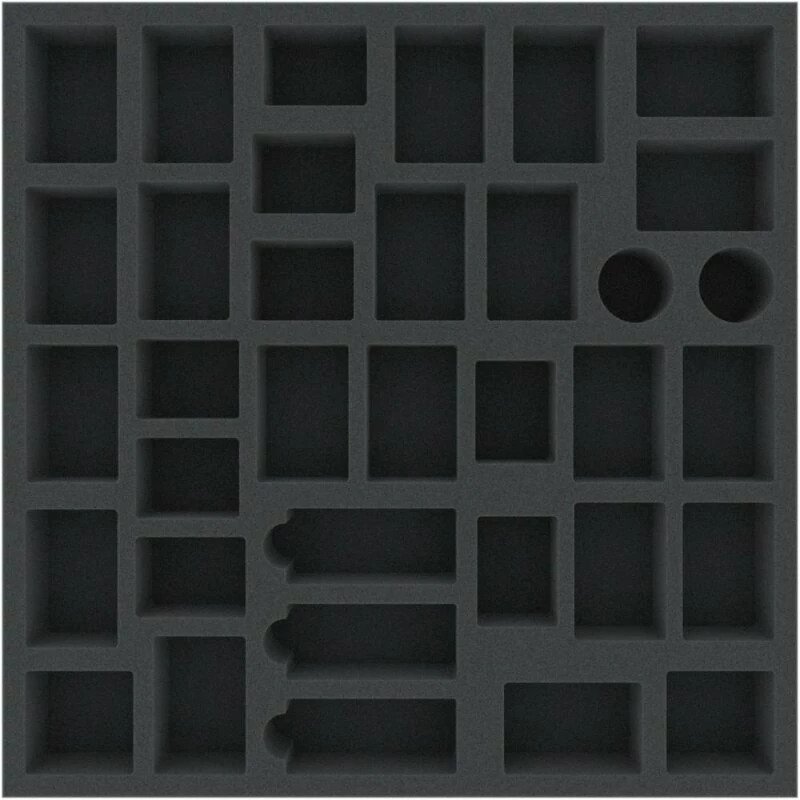 Diese Schaumstoffeinlage verfügt über 35 Fächer, in denen du Brettspielzubehör wie Miniaturen, Token und Würfel sicher und geordnet aufbewahren kannst.