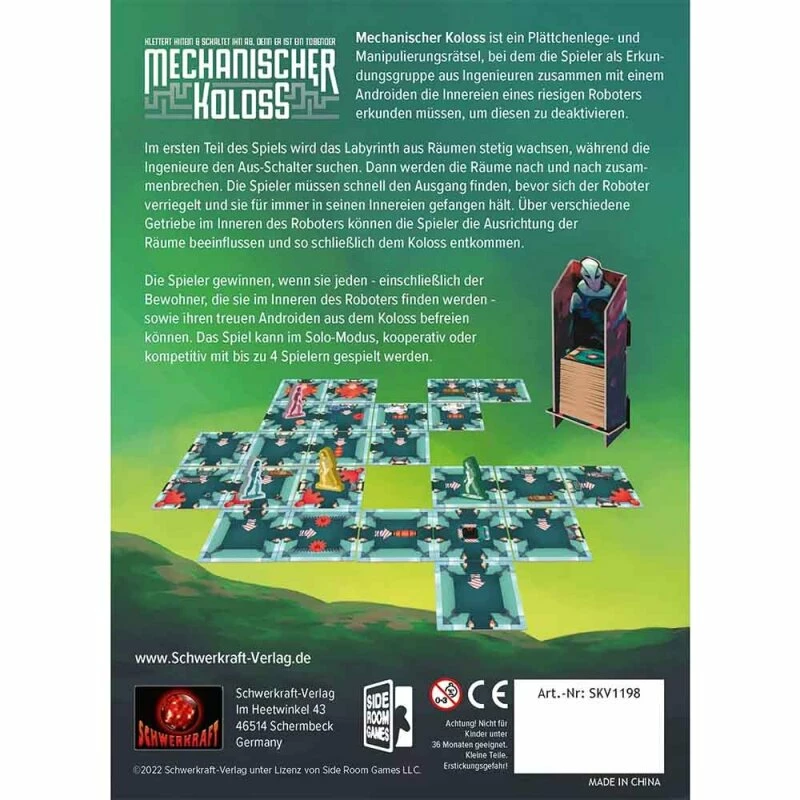 Mechanischer Koloss ist ein kooperatives Plättchenlegespiel, bei dem die Plättchen auch nach dem Legen noch manipuliert werden können. Die Spielregeln enthalten Varianten für das semi-kooperative und das kompetitive Spiel. Das Spiel lässt sich in 4 Schwierigkeitsstufen spielen.