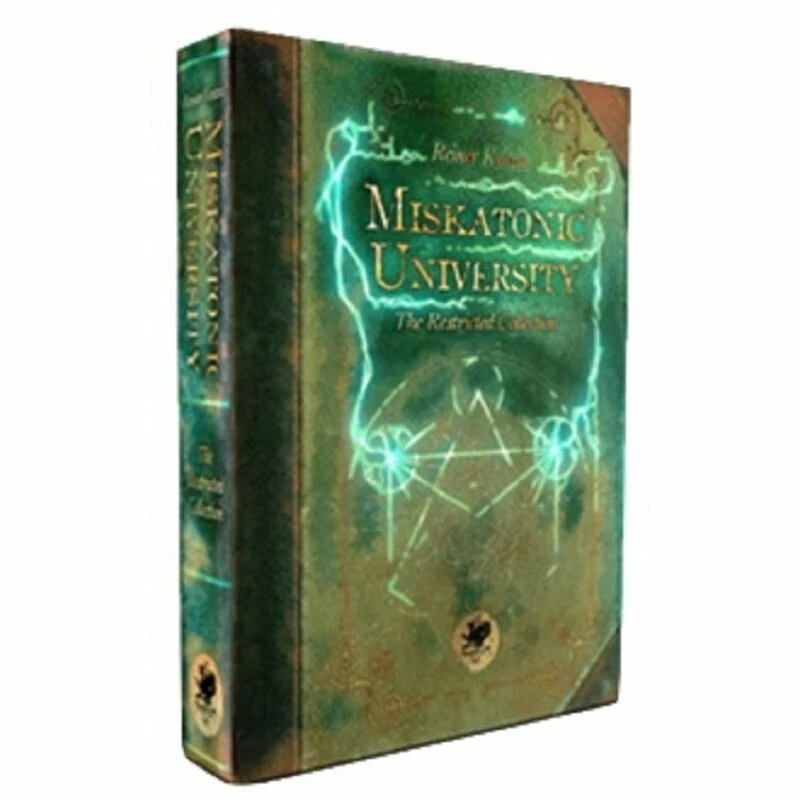 Miskatonic University: The Restricted Collection lasts five rounds, and each round continues until no one is left in the library, each player having left voluntarily or having been expelled. Basic play consists of taking turns to select a library card and placing these cards face up on your player mats. Library cards come in three types: Sigil pieces, Grimoire fragments, and Graduate students. Three Sigil pieces or Grimoire fragments make a set and earn a lore card. Picking up a duplicate leads to expulsion unless you can use your defenses. Collecting four Graduate students means you can re-use one of your defense cards.