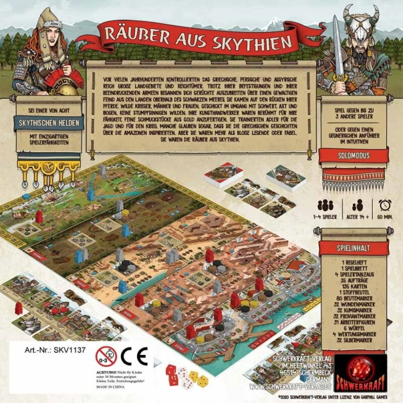 Räuber aus Skythien ist ein Arbeiter-Einsetz-Spiel, bei dem die Spieler ihre Bande zusammenstellen, um mit dieser Plünderungen durchzuführen. Jedes Bandenmitglied hat unterschiedliche Fähigkeiten, je nachdem, ob es in die Bande aufgenommen wurde oder auf dem Dorfplatz ausgespielt wurde. Außerdem können Adler und/oder Pferde an Bandenmitglieder angelegt werden, um ihnen neue Möglichkeiten zu geben.