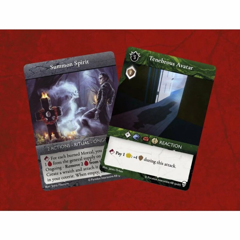 Shadows & Shrouds is an expansion for Vampire: The Masquerade – Rivals that adds two new clans: LASOMBRA & HECATA. The Lasombra love to win and will spend and risk their agenda to do so, often employing long shadows to do their bidding. The Hecata are necromancers obsessed with death, using the blood of dead mortals to fuel their occult practices. You may play these two clans head-to-head or integrate them with your Core Set and other expansions to make your coterie step out of the shadows and into the winner’s circle.