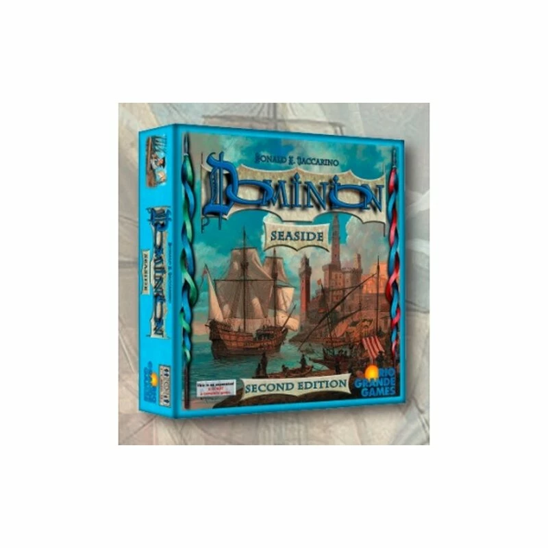 This is the 2nd addition to Dominion. It adds 26 new Kingdom cards to Dominion. Its central theme is your next turn; there are cards that do something this turn and next, cards that set up your next turn, and other ways to step outside of the bounds of a normal turn. Dominion: Seaside is an expansion to both Dominion and Dominion: Intrigue. As such, it does not contain material for a complete game. Specifically, it does not include the Treasure, Victory, Curse, or Trash cards. Thus, you will need either the base game or Intrigue to play with this expansion and have experience playing Dominion with either of the first two games. It is designed to work with either or both of these sets, and any future expansions that may be published.