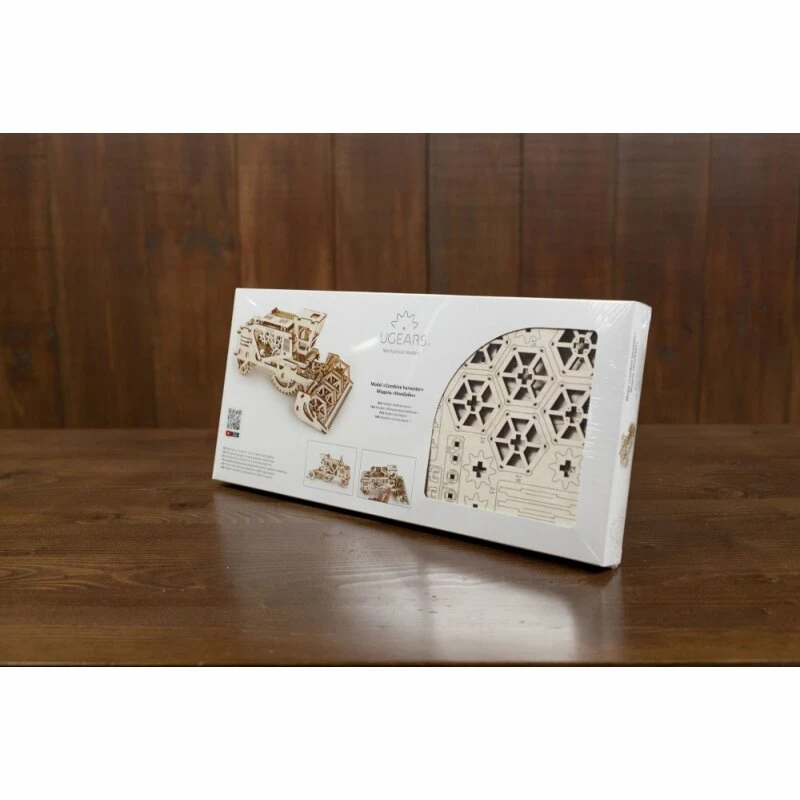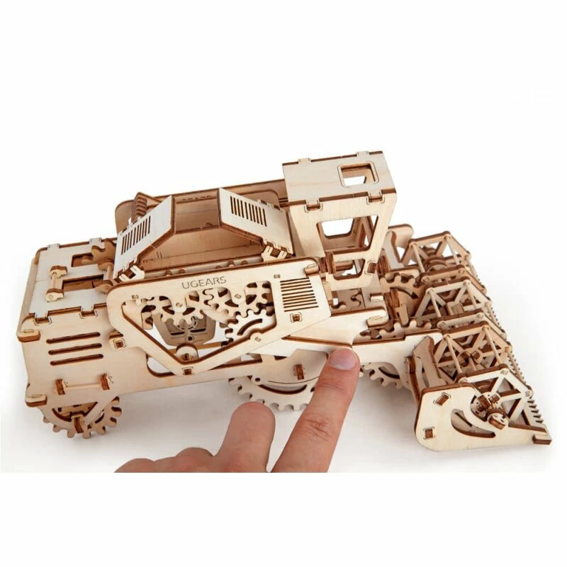 Der Ugears Mähdrescher (Ugears Combine) ist ein kleines mechanisches Wunderwerk mit einer Vielzahl interessanter Funktionen. Durch eine Rückwärtsbewegung des Ugears Mähdreschers wird sein Gummimotor aufgezogen. Nach Lösen des Bremshebels setzt er sich in Bewegung, dabei dreht das Mähwerk wie bei einem echten Mähdrescher. Beim Anziehen des Bremshebels stoppt der Ugears Mähdrescher. An dem Modell ist ein Geheimfach verbaut, das sich mit einem Hebel links vom Führersitz öffnen lässt.