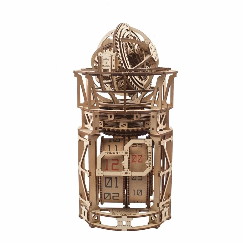 Die von den Deisten des 17. Jahrhunderts vertretene Theorie des Uhrwerk-Universums besagte, dass Himmel und Erde sowie deren Bewegungen wie eine gigantische Uhr funktionierten, und Gott dabei der Uhrmacher war. Man ging davon aus, dass die drei Grundgesetze der Bewegung und das Gravitationsgesetz von Newton ausreichten, um Phänomene aller Art mithilfe mechanischer Konzepte zu erklären. Mechanische Konzepte sind für Ugears das Größte! In Anlehnung an Isaac Newton präsentieren wir deshalb die Tourbillon-Tischuhr Sternengucker, eine faszinierende Kombination aus fantasievollem astronomischem Observatorium und funktionaler Tischuhr!