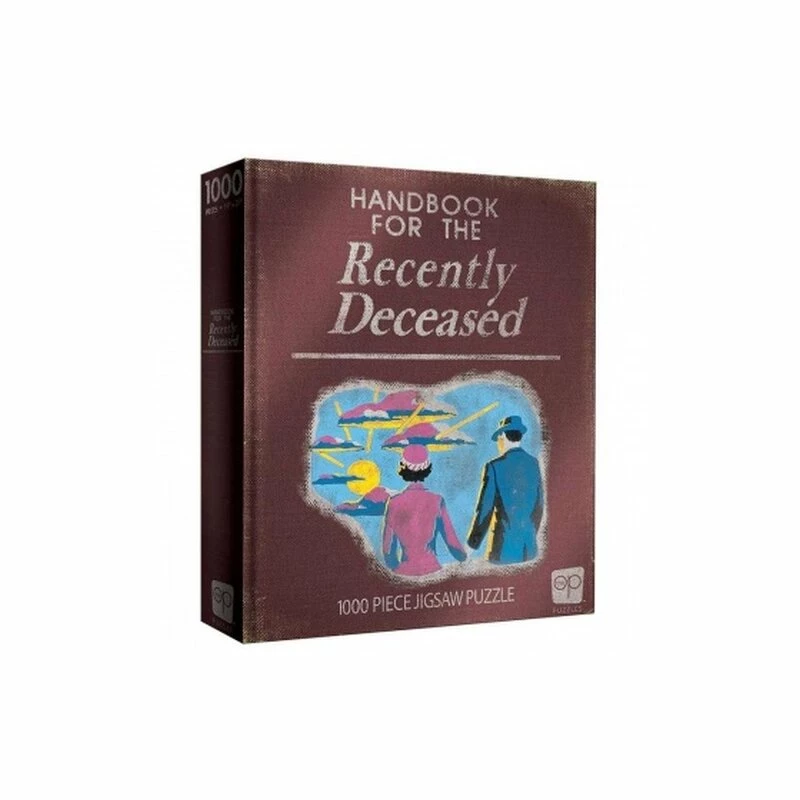 Setze mit diesem 1.000-teiligen Beetlejuice-Puzzle „Handbuch für kürzlich Verstorbene“ deinen Führer durch die Welt nach dem Tod zusammen. Es zeigt das realistisch abgenutzte Titelbild des Buches, das Adam und Barbara Maitland nach ihrem tödlichen Unfall gefunden haben.